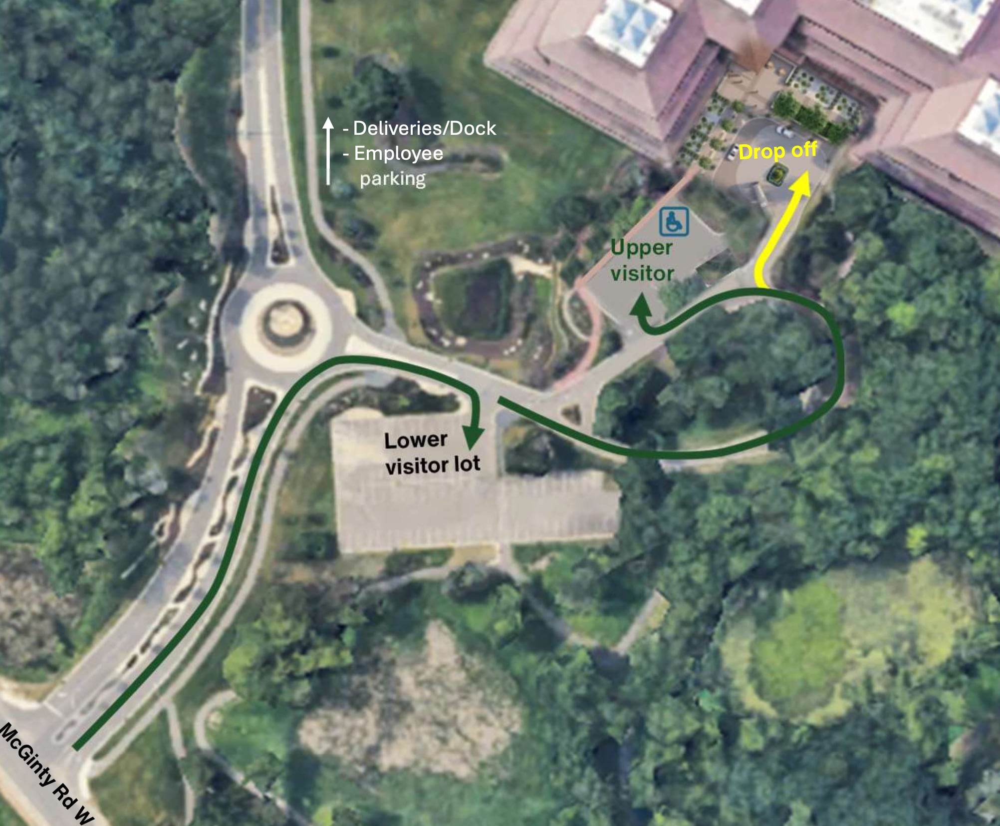 Take the next right to the lower visitor parking or continue up the hill & around the trees to the next right to drop off/pick up at the glass entrance or continue to the upper visitor lot and accessible parking.